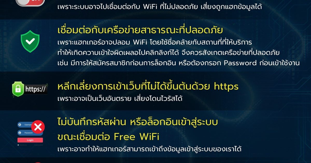 ปัจจุบัน WiFi ฟรี หรือ WiFi สาธารณะ มีให้บริการทั่วไป แต่มิจฉาชีพอาจใช้เป็นช่องทาง แฮก ปล่อยมัลแวร์ ดูดข้อมูล ขโมยพาสเวิร์ด