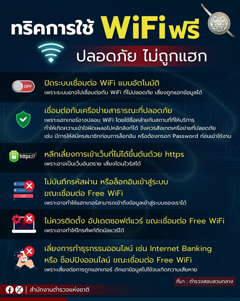 สำนักงานตำรวจแห่งชาติ ขอแชร์ทริคจากตำรวจสอบสวนกลาง (CIB) แนะนำวิธีใช้ Free WiFi ให้ปลอดภัย ดังนี้